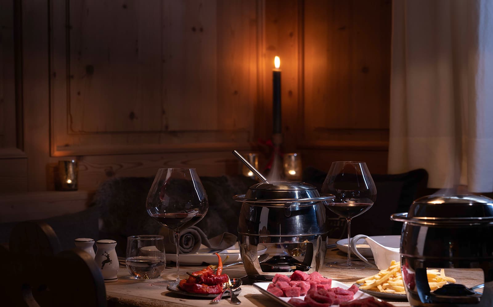 Alles ist möglich im Chalet N: Beispielsweise ein Winter-Barbecue auf der Terrasse des Chalets oder ein kleiner Weihnachtsmarkt, mit Glühwein, Punsch und heißen Maronen – alles vor der wunderschönen Kulisse der tiefverschneiten Berglandschaft. Wer es traditionell-alpin liebt, dem sei das Walser-Stübli mit Fondue, Raclette und Grillen auf dem heißen Stein empfohlen.